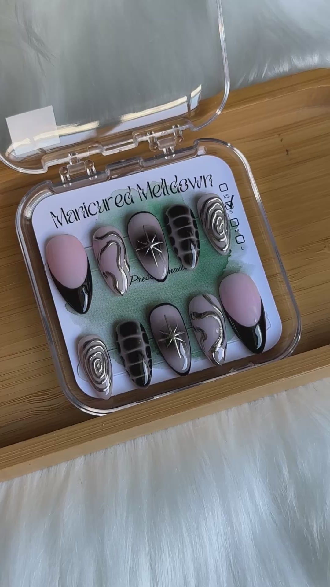 Striking, sleek, and unapologetically bold, Midnight Eclipse press‑on nails feature a modern contrast of soft blush tones and inky black accents. Elevated with swirling chrome detailing and sharp starburst highlights, this set delivers a dramatic, high‑fashion finish with an artistic edge.